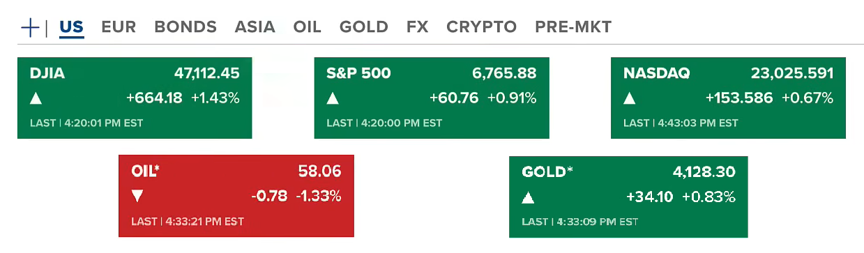 Chứng khoán Hoa Kỳ tiếp tục tăng trong thứ ba (25/11-US) với Dow Jones tăng nhiều nhất 1.43%. Hợp đồng dầu giam rveef 58 USD/thùng. Vàng tăng nhẹ lên quanh 4128 USD/ounce.