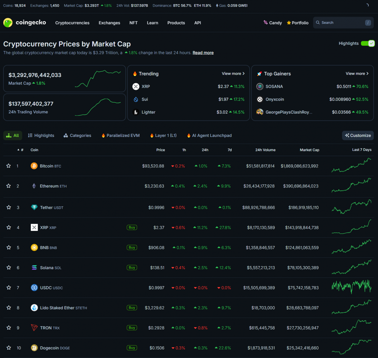 Bitcoin cũng tăng lên quanh 93,000 USD. Các altcoin lớn đều tăng, và XRP tăng nhiều nhất hơn 11%. Vốn hóa thị trường crypto tăng lên 3.29 nghìn tỷ USD.