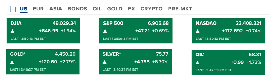 Chứng khoán Hoa Kỳ thứ hai (05/01/2026-US) kết thúc phiên giao dịch đầu năm với sự tăng trưởng ở cả ba chỉ số, trong đó Dow Jones tăng nhiều nhất 1.34%. Hợp đồng dầu cũng tăng nhẹ lên 58.31 USD/thùng. Vàng tăng lên 4450 USD/oune, còn bạc bất ngờ tăng đáng kể lên 75.77 USD/thùng.