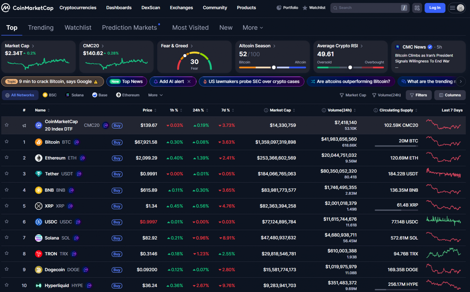 Bitcoin tăng lên quanh 67,000 USD và 68,000 USD. Các altcoin lớn đa số tăng nhẹ. Vốn hóa thị trường crypto tăng lên 2.34 nghìn tỷ USD.