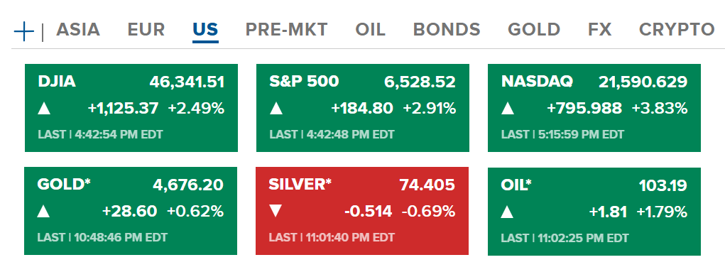 Chứng khoán Hoa Kỳ thứ ba (31/03-US) kết thúc phiên các chỉ số đều tăng đáng kể trên 2%. Hợp đồng vàng cũng tăng lên 4676 USD/ounce, còn bạc giảm nhẹ về 74.4 USD/ounce. Dầu sau khi điều chỉnh nhẹ đã lại tăng lên hơn 103 USD/thùng.