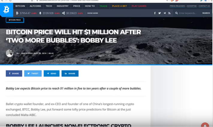 Bên cạnh đó, Bobby Lee (Giám đốc điều hành của BTCC – một sàn giao dịch bitcoin lớn ở Trung Quốc) cho rằng giá bitcoin có thể đạt tới 1.000.000 đô-la trong tương lai.