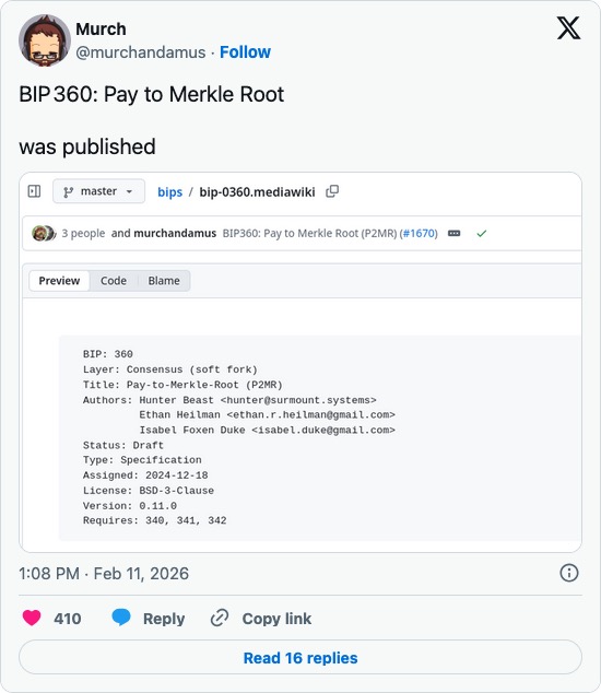 Các nhà phát triển Bitcoin đã đưa một đề xuất mới có tên là BIP 360 vào quy trình thảo luận nâng cấp chính thức. Mục tiêu là giúp Bitcoin chuẩn bị cho khả năng trong tương lai, khi các máy tính lượng tử cực mạnh có thể phá vỡ hệ thống mã hóa hiện tại. Đề xuất này giới thiệu một loại địa chỉ mới gọi là Pay to Merkle Root (P2MR), nhằm giảm nguy cơ bị lộ khóa riêng và hạn chế khả năng bị đánh cắp tài sản. Nó hoạt động tương tự Taproot nhưng loại bỏ một tính năng có thể làm lộ khóa công khai, nên về lý thuyết sẽ an toàn hơn.
