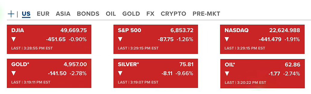 Chứng khoán Hoa Kỳ thứ năm (12/02-US) đang chịu áp lực mạnh khi chứng khoán đồng loạt giảm sâu, đặc biệt Nasdaq mất gần 2%, hai chỉ số còn lại cũng giảm. Hợp đồng dầu giảm về 62.86 USD/thùng. Vàng và bạc cũng giảm về 4957 USD/ounce và 75.81 USD/ounce.