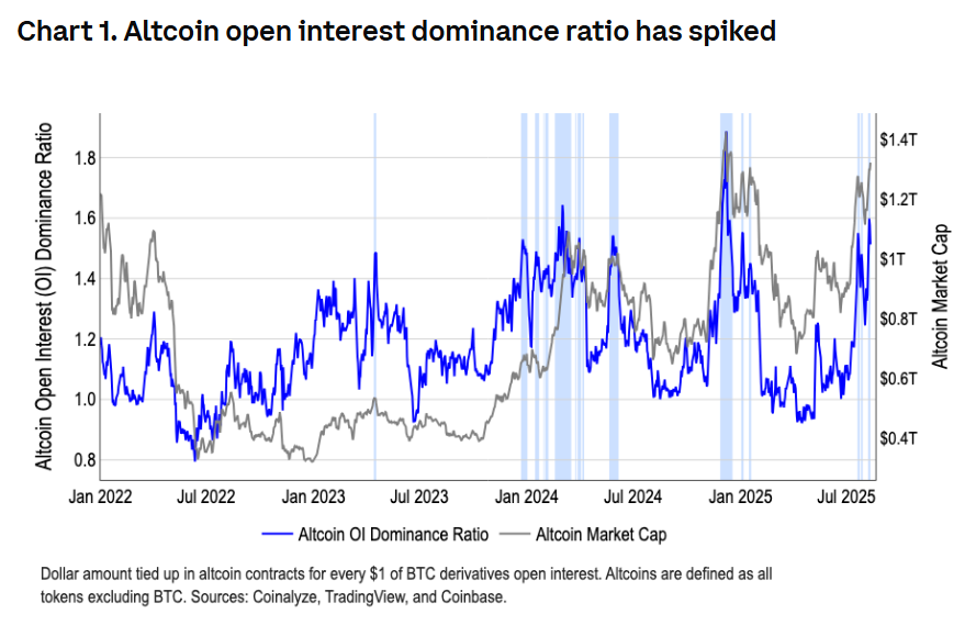Mới đây, Coinbase đưa ra dự báo rằng các điều kiện thị trường đang hội tụ để mở ra một mùa altcoin toàn diện. Từ tháng 5 đến tháng 8 năm 2025, sự thống trị thị trường của Bitcoin đã giảm từ 65% xuống còn khoảng 59%, gợi mở dấu hiệu đầu tiên của làn sóng luân chuyển vốn sang altcoin. Mặc dù chỉ số Mùa Altcoin của CoinMarketCap vẫn ở mức thấp 40, chưa chạm ngưỡng 75 để xác nhận một mùa altcoin rõ rệt, vốn hóa thị trường altcoin đã tăng hơn 50% kể từ đầu tháng 7, đạt 1.4 nghìn tỷ USD vào ngày 12/8. Những dữ kiện này khiến nhiều nhà quan sát cho rằng thị trường đang tiến gần đến một mùa altcoin toàn diện khi bước sang tháng 9.