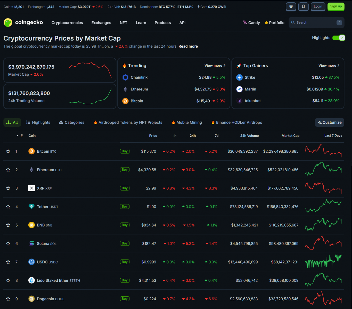 Bitcoin điều chỉnh nhẹ về 115,000 USD. Hầu hết các altcoin lớn cũng điều chỉnh. Vốn hóa thị trường crypto là 3.97 nghìn tỷ USD.