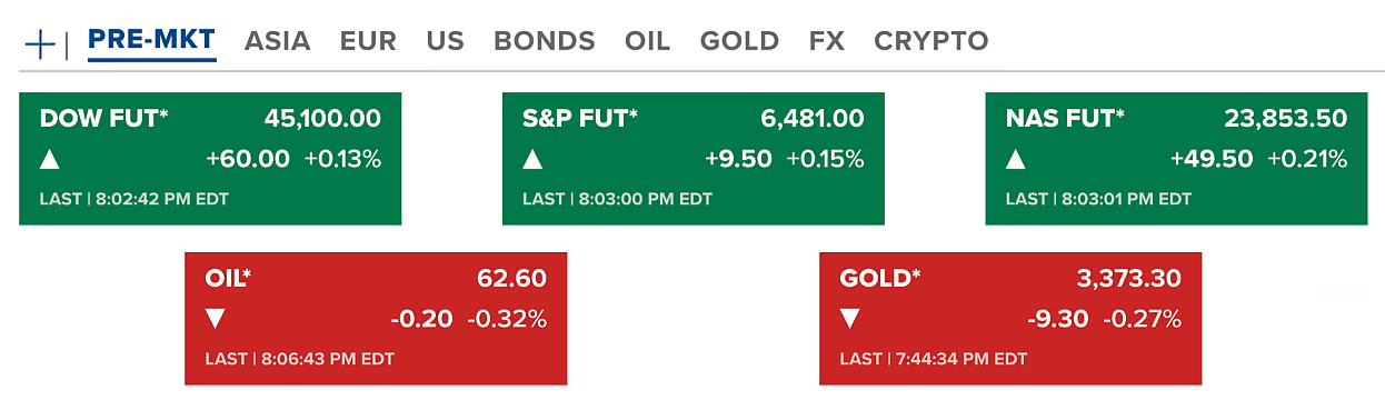 Chứng khoán Hoa Kỳ chủ nhật (17/08-US), thị trường hợp đồng tương lai tăng nhẹ ở cả ba chỉ số. Hợp đồng dầu giảm về quanh 62.6 USD/ounce. Vàng cũng điều chỉnh nhẹ ở mức 3373 USD/thùng.