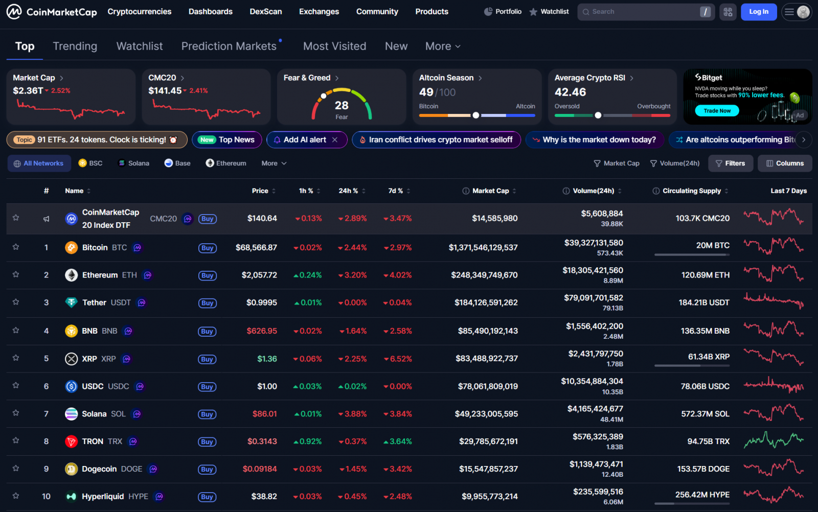 Không ngoại lệ, Bitcoin cũng giảm về quanh 68,000 USD. Các altcoin lớn đồng loạt giảm. Vốn hóa thị trường crypto cũng giảm về 2.36 nghìn tỷ USD.
