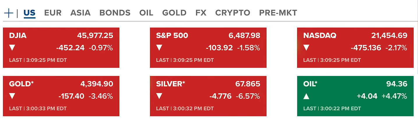 Chứng khoán Hoa Kỳ thứ năm (26/03-US) gần cuối phiên cả ba chỉ số đều giảm, với Nasdaq giảm nhiều nhất 2.17%. Hợp đồng vàng và bạc cũng giảm về lần lượt 4394 USD/ounce và 67.86 USD/ounce. Riêng dầu tăng và giữ ở mức cao 94.36 USD/thùng.
