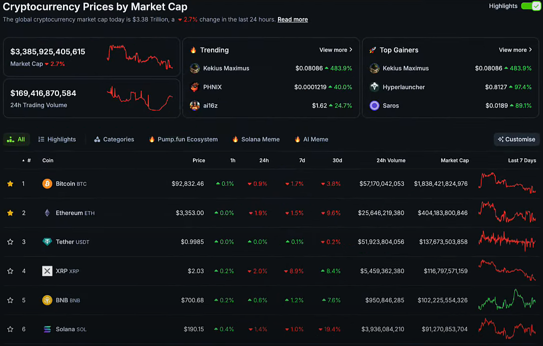Bitcoin cũng điều chỉnh về quanh 92,000 USD. Đa số các altcoin lớn đều điều chỉnh. Vốn hóa thị trường crypto giảm 2.7% về 3.385 nghìn tỷ USD.
