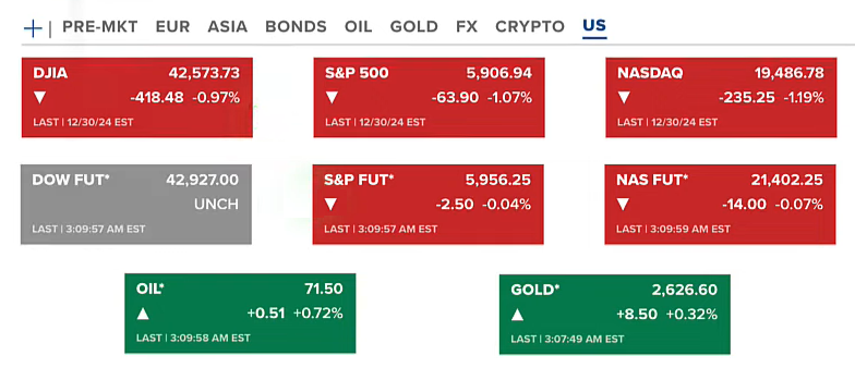 Thị trường tài chính nói chung có sự điều chỉnh đợt cuối năm, đặc biệt những ngày gần đây. Chứng khoán Hoa Kỳ thứ hai (30/12) cũng tiếp tục là một phiên giảm ở cả ba chỉ số. Hợp đồng tương lai của chứng khoán cũng cùng xu hướng giảm. Hợp đồng vàng và dầu thì tăng nhẹ lên quanh 2626 USD/ounce và 71.5 USD/thùng.