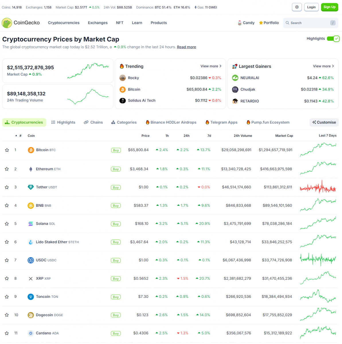 Về crypto, giá BTC có thời điểm điều chỉnh nhẹ về quanh 63,000 USD và sau đó lại trở lại 65,000 USD. Đa số các altcoin xanh lại khi BTC hồi phục. Vốn hóa thị trường crypto là 2.515 nghìn tỷ USD.