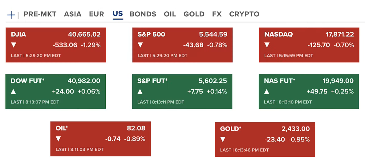 Chứng khoán Hoa Kỳ thứ năm (18/07) kết thúc phiên giao dịch cả ba chỉ số đều giảm. Tuy nhiên, hợp đồng tương lai của chứng khoán lại xanh nhẹ. Hợp đồng vàng và dầu cũng điều chỉnh nhẹ về 2433 USD/ounce và 82 USD/thùng.
