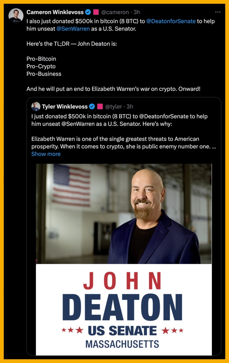 Anh em sinh đôi Winklevoss vừa quyên góp 16 BTC tổng cộng (~1 triệu USD) cho John Deaton để ủng hộ cuộc bầu cử chiếc ghế thượng viện chống lại thượng nghị sĩ anti-crypto Elizabeth Warren.