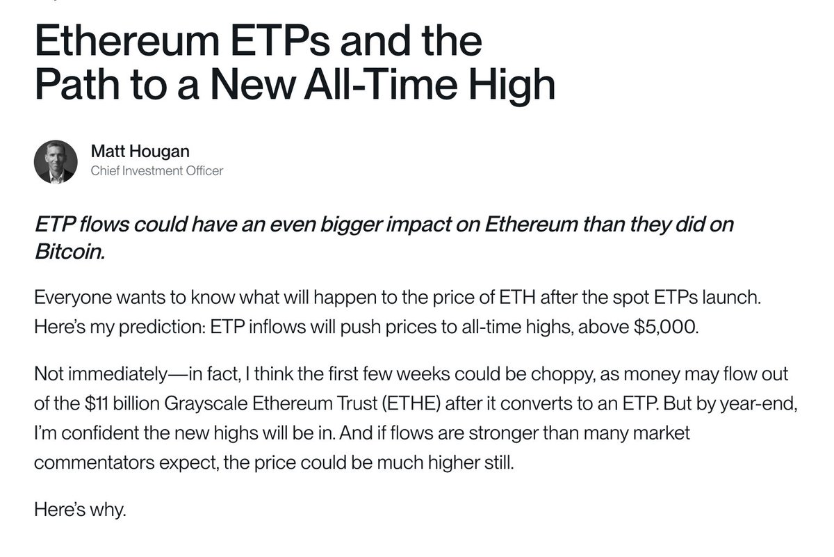 Chỉ còn chưa đầy 1 tuần nữa là Ethereum Spot ETF ra mắt, Matt Hougan, Giám đốc Đầu tư của Bitwise, đã công bố bài viết với 3 lý do tại sao Ethereum sẽ đạt đỉnh mới vào cuối năm, mặc dù vài tuần đầu tiên có thể không ổn định do lực bán từ quỹ Grayscale. Tóm tắt bài viết của Matt Hougan: