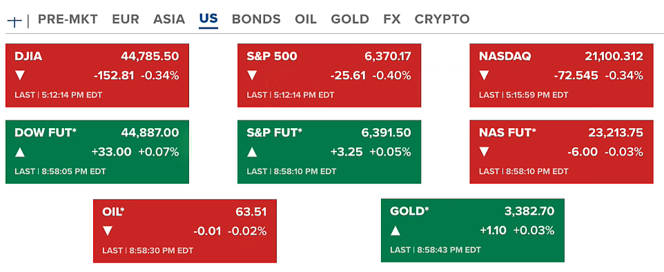 Chứng khoán Hoa Kỳ thứ sáu (21/08-US) kết thúc với cả ba chỉ số đều tiêp tục giảm trên 0.3% trong khi chờ chủ tịch FED phát biểu. Hợp đồng tương lai của chứng khoán đi ngang. Dầu và vàng không thay đổi nhiều, vẫn quanh 63 USD/thùng với dầu và 3382 USD/ounce với vàng.