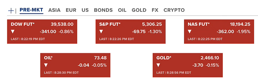 Dù cuối tuần nhưng thị trường hợp đồng tương lai của chứng khoán Hoa Kỳ cũng giảm đáng kể, nhiều nhất là Nas FUT giảm 1.95%. Không chỉ Hoa kỳ, chỉ số Nikkei sau khi mở cửa cũng đã giảm hơn 5%. Hợp đồng vàng và dầu cùng xu hướng giảm về quanh 2466 USD/ounce và 73 USD/thùng.