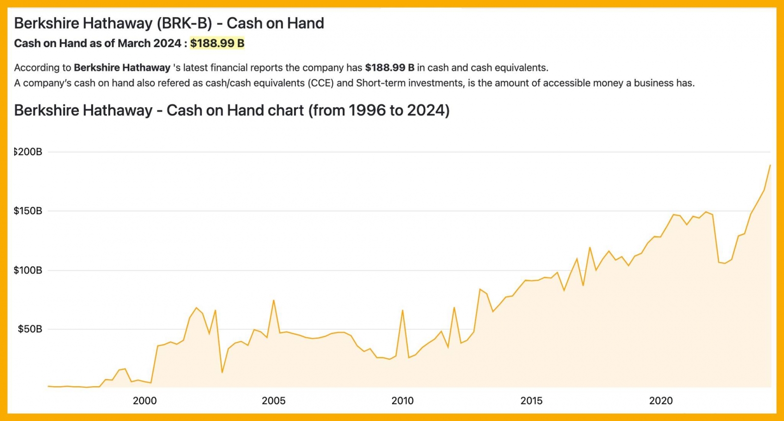 Nếu bạn nhìn vào biểu đồ tiền mặt của Berkshire Hathaway, bạn sẽ thấy từ năm 1996 tới giờ, số tiền mặt ngày càng tăng. Tính đến quý 1 năm 2024, số tiền mặt đã là 189 tỷ USDvà tính đến quý 2 năm nay thì đã là 277 tỷ USD.