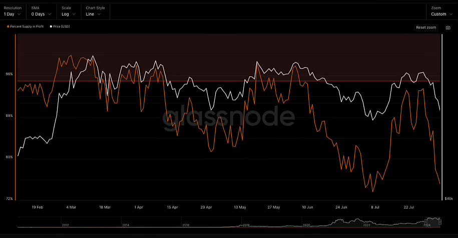Tỷ lệ BTC có lời cũng giảm về 75% khi giá BTC giảm về 56,000 USD.