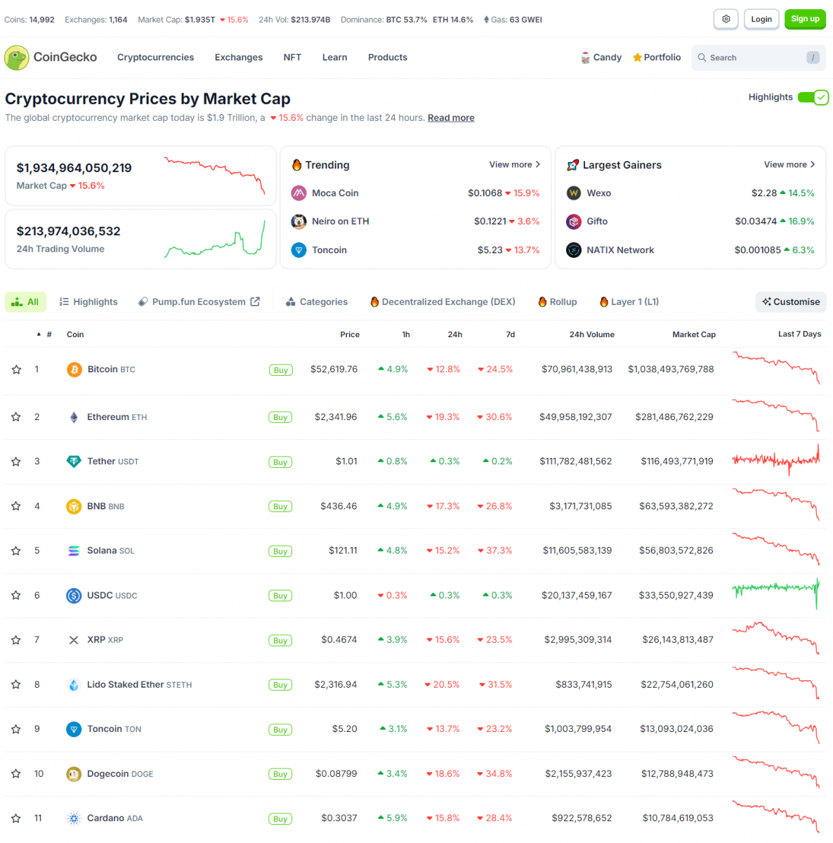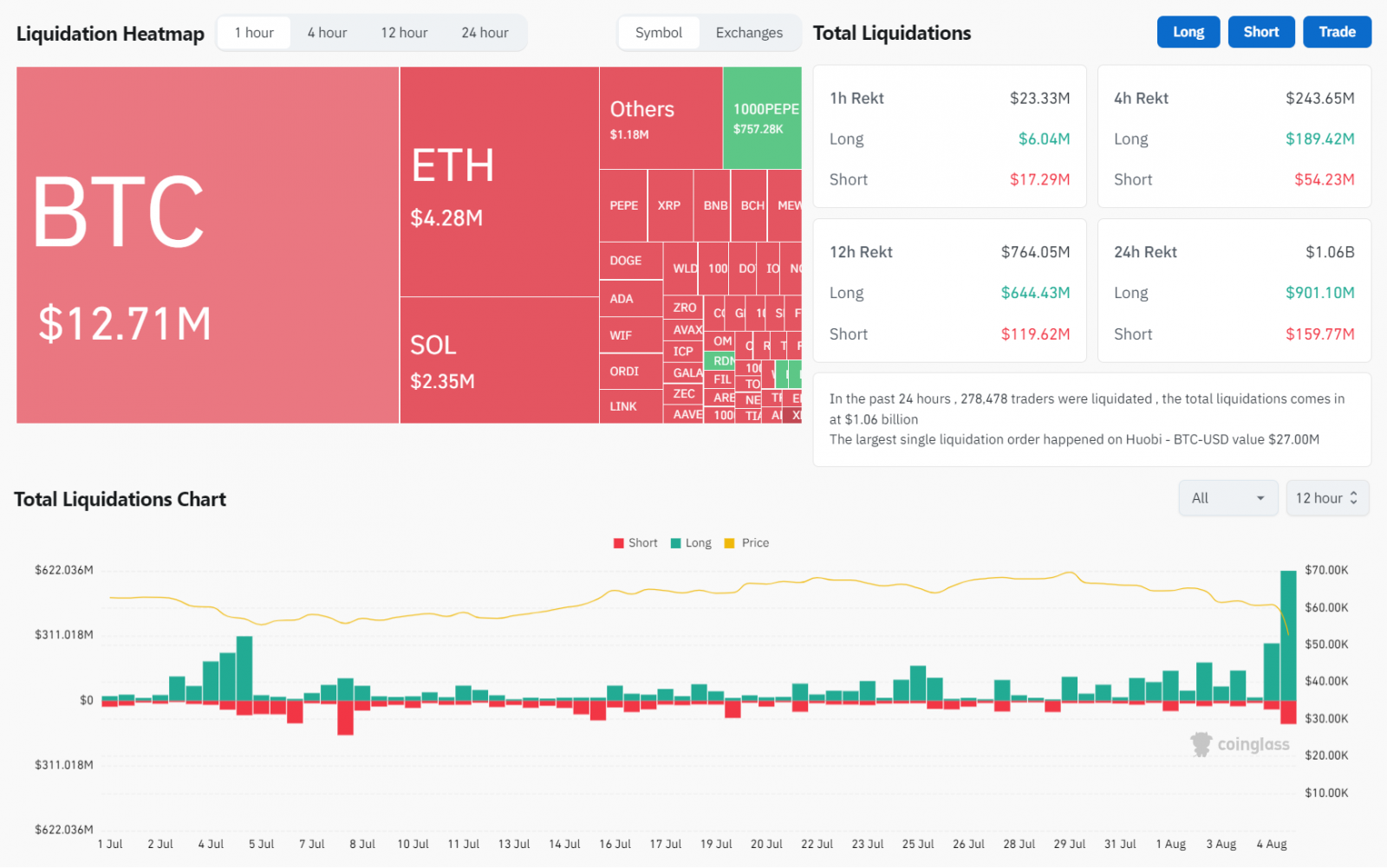 Hầu hết các thị trường đều giảm trong ngày qua bởi các nhà đầu tư lo lắng nguy cơ suy thoái tài chính. Bitcoin ngày qua (04/08-giờ US) đã giảm sâu về 52,000 USD. Hầu hết các altcoin cũng giảm đáng kể. Vốn hóa thị trường crypto giảm hơn 15% về 1.934 nghìn tỷ USD.