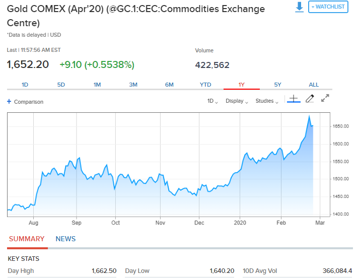 Cụ thể khi nhìn vào biến động của vàng trong năm qua ta sẽ thấy rõ. Trong vòng một năm qua thì giá vàng đã tăng từ hơn 1.500 USD lên đến hiện tại là hơn 1.650 USD.