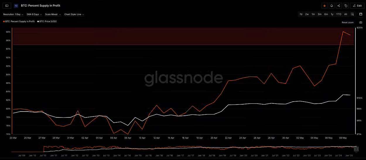 Tỷ lệ BTC có lời cũng đã tăng lên 97.2% khi giá BTC tăng. Phần lớn nhà đầu tư hiện nay đang có lời.