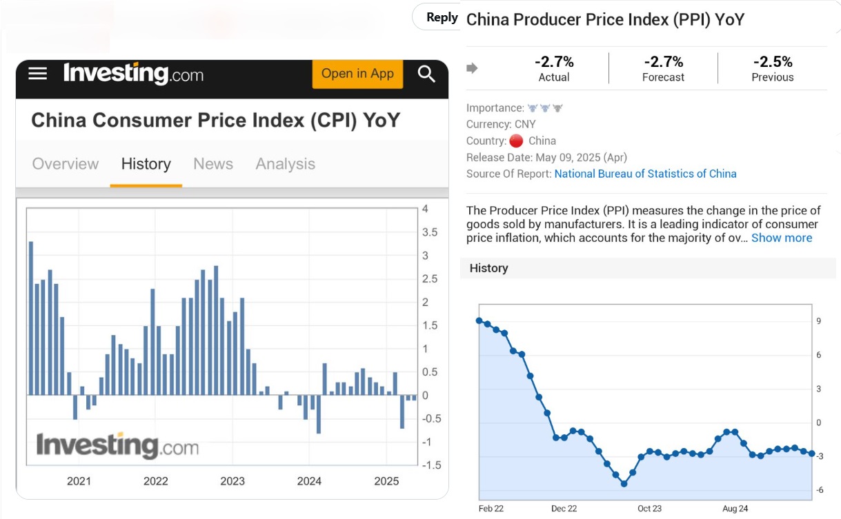 Không chỉ CPI mà cả chỉ số giá sản xuất (PPI) cũng đang âm sâu, ở mức -2.7%, cho thấy sức khỏe khu vực sản xuất cũng suy yếu rõ rệt. Xu hướng giảm phát kéo dài từ đầu 2022 đến nay, bất chấp nỗ lực từ Ngân hàng Nhân dân Trung Quốc.
