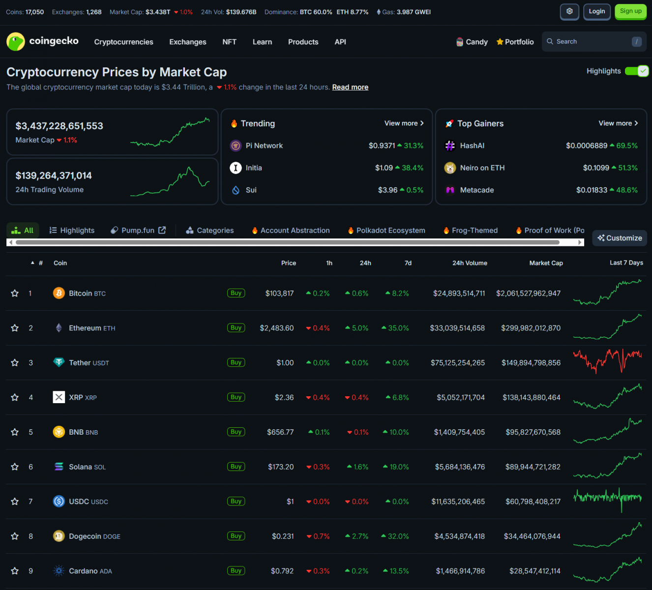Thứ bảy (10/05-US), Bitcoin tăng nhẹ lên quan 103,800 USD. Nhiều altcoin lớn vẫn tăng đáng kể như ETH, một số altcoin điều chỉnh nhẹ trong vòng 24 giờ. Vốn hóa thị trường crypto là 3.437 nghìn tỷ USD.