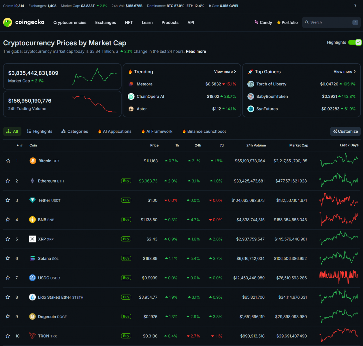 Bitcoin nhẹ lên 111,100 USD. Hầu hết các altcoin lớn cũng tăng nhẹ. Vốn hóa thị trường crypto cũng tăng lên 3.83 nghìn tỷ USD.