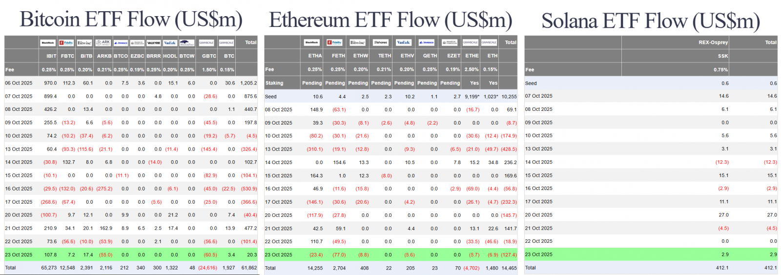 Các quỹ BTC spot ETF Hoa Kỳ có dòng tiền vào nhẹ 20.3 triệu USD. Trong khi đó, ETH spot ETF vẫn có dòng tiền rời khỏi 127.4 triệu USD. Còn SOL ETF có 2.9 triệu USD tiền vào.