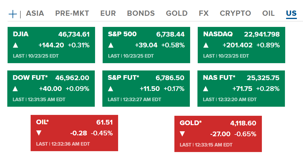 Chứng khoán Hoa Kỳ thứ năm (23/10-US) kết thúc phiên giao dịch cả ba chỉ số đều tăng, với Nasdaq tăng nhiều nhất 0.89%. Hợp đồng tương lai của chứng khoán cũng tăng nhẹ. Dầu tăng lên 61.5 USD/thùng và có điều chỉnh nhẹ. Vàng cũng giảm về 4118 USD/ounce.
