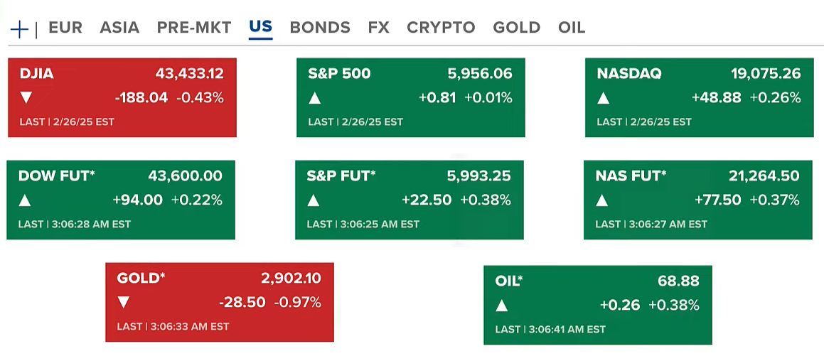 Chứng khoán Hoa Kỳ thứ tư (26/02) hồi phục nhẹ ở chỉ số Nasdaq, còn Dow Jones vẫn giảm và S&P 500 đi ngang. Hợp đồng tương lai của chứng khoán tăng nhẹ. Giá vàng giảm về 2902 USD/ounce. Dầu ở mức 68.8 USD/thùng.