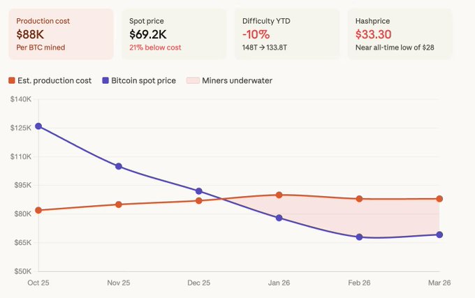 Chi phí đào Bitcoin trung bình ước tính khoảng 88,000 USD/BTC, cao hơn nhiều so với giá thị trường khoảng 69,000 USD, khiến thợ đào lỗ khoảng 21% mỗi block. Nguyên nhân chính là giá năng lượng tăng mạnh, đặc biệt do căng thẳng xung đột Iran khiến giá dầu tăng, kéo theo chi phí điện cũng tăng.
