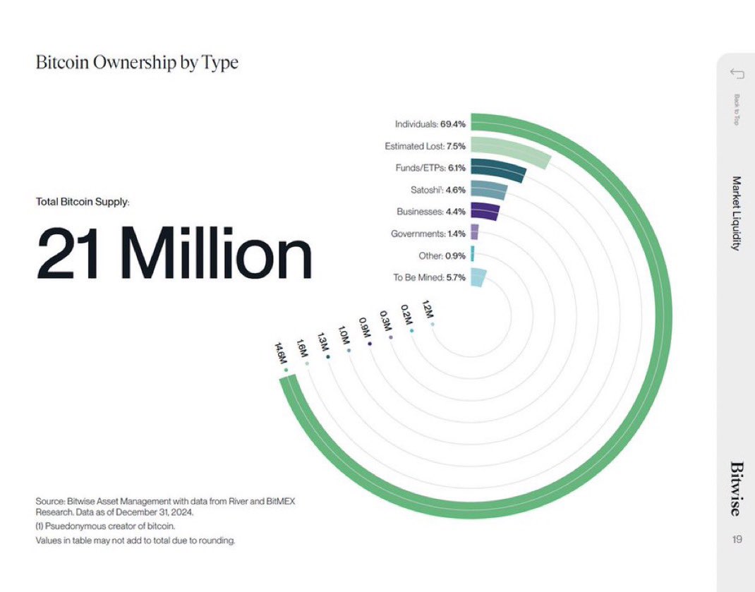 Bitwise Asset Management cho biết các chính phủ và công ty muốn mua Bitcoin sẽ phải mua từ những cá nhân sẵn sàng bán. Hiện chỉ còn 5.7% Bitcoin chưa được đào và 7.5% đã bị mất vĩnh viễn, khiến nguồn cung ngày càng khan hiếm.
