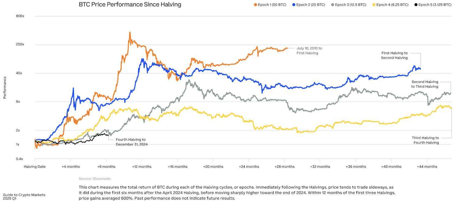 Trong biểu đồ, mỗi đường thể hiện cho sự biến động của giá BTC ở một chu kỳ khác nhau. Như đường màu cam đại diện cho giá BTC trong chu kỳ halving đầu tiên. Màu đen là chu kỳ hiện tại.