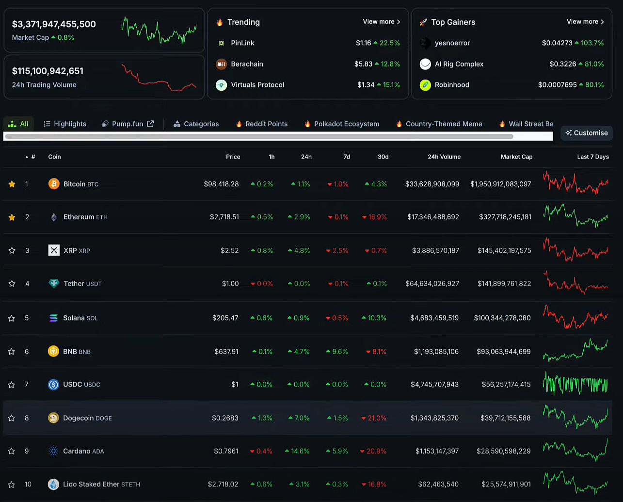 Bitcoin ngày qua đã tăng nhẹ lên 98,000 USD. Nhiều altcoin lớn hồi phục đáng kể. Vốn hóa thị trường crypto cũng tăng lên 3.37 nghìn tỷ USD.