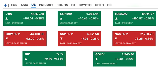 Thứ hai tại Hoa Kỳ (ngày 10/02 – US), thị trường chứng khoán đóng cửa tăng ở cả ba chỉ số, Nasdaq tăng nhiều nhất 0.98%. Hợp đồng tương lai của chứng khoán điều chỉnh nhẹ. Dầu và vàng đều tăng lên lần lượt 72.7 USD/ounce và 2940 USD/thùng.