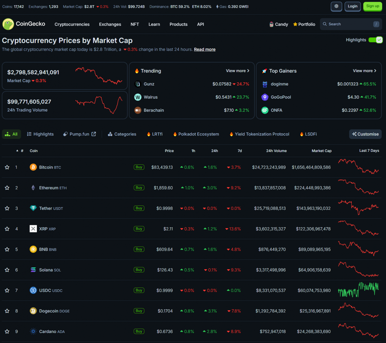Bitcoin tăng nhẹ lên 83,000 USD sau khi giảm về 82,000 USD. Một số altcoin lớn giám, một số hồi nhẹ theo BTC. Vốn hóa thị trường crypto là 2.79 nghìn tỷ USD.