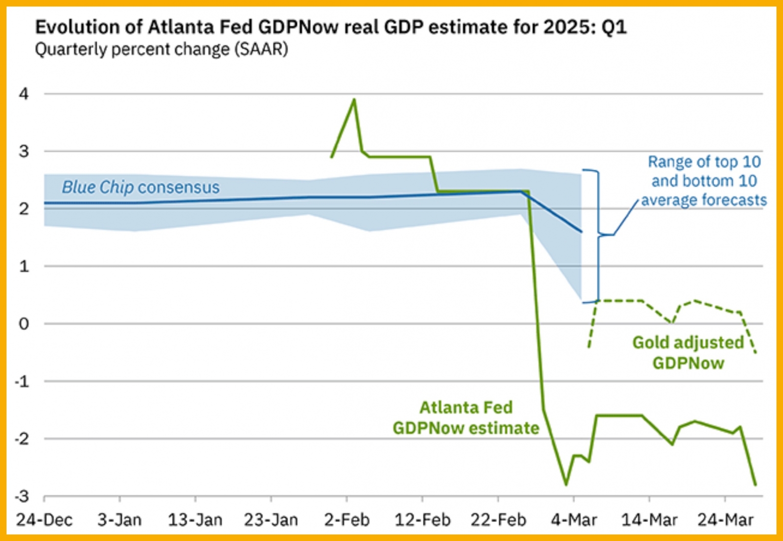 Với tình hình kinh tế Hoa Kỳ hiện nay, Cục Dự trữ Liên bang Atlanta vừa công bố dự báo mới nhất từ mô hình GDPNow cho quý 1 năm 2025, với con số giảm mạnh xuống -2,8%, một sự suy giảm đáng kể so với những ước tính trước đó. Chỉ bốn tuần trước, dự báo vẫn ở mức +2,3%, và tám tuần trước thậm chí còn đạt +3,9%. Diễn biến này đặt ra nhiều câu hỏi về triển vọng kinh tế trong ngắn hạn và khả năng xảy ra suy thoái.