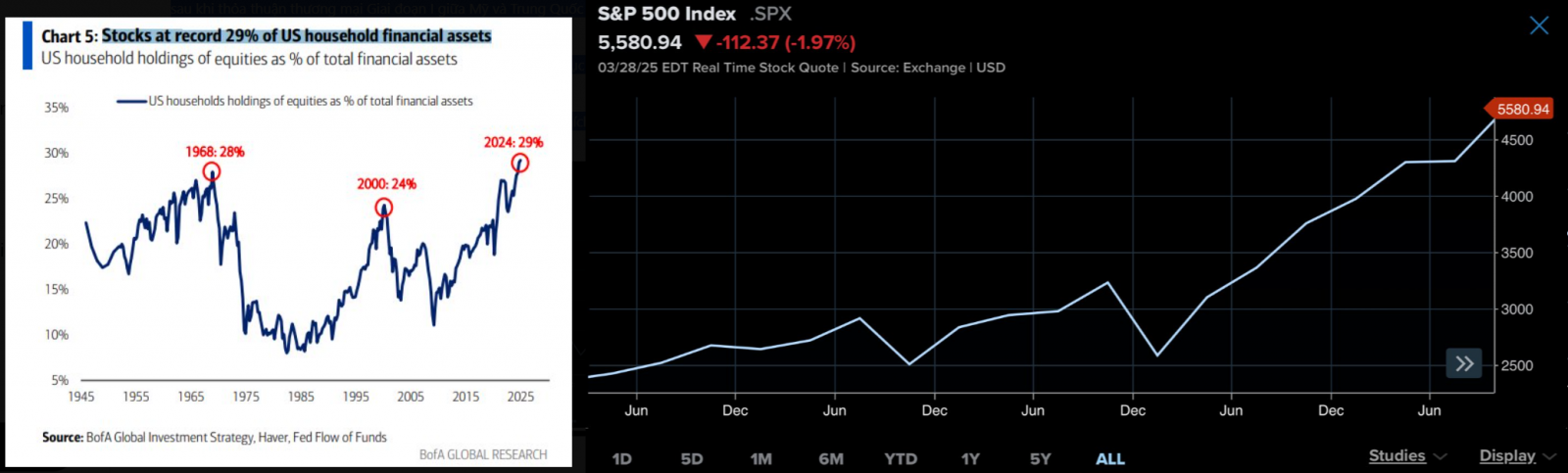 Mới đây, Bank of America nói rằng: “Các hộ gia đình Mỹ đã phân bổ kỷ lục 29% tài sản tài chính của họ vào cổ phiếu.”