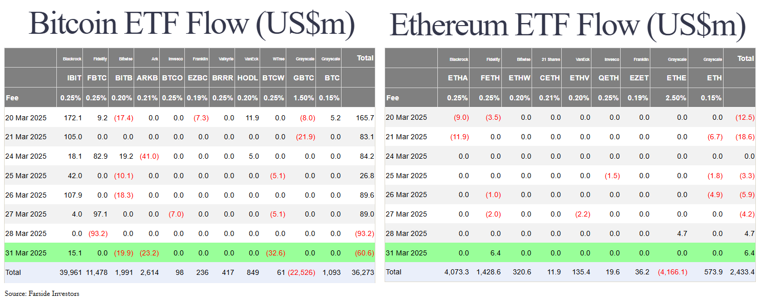 Các quỹ BTC spot ETF Hoa Kỳ thứ hai (31/03-US) tiếp tục có dòng tiền rời khỏi với tổng 60.6 triệu USD. Còn ETH spot ETF có dòng tiền vào dương 6.4 triệu USD.