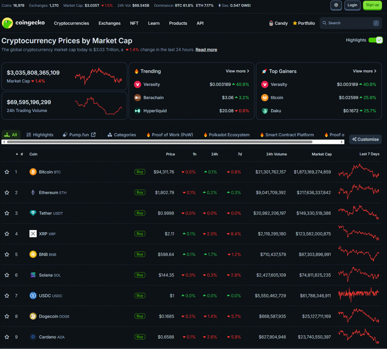 Bitcoin điều chỉnh nhẹ quanh 94,000 USD. Hầu hết các altcoin lớn giảm. Vốn hóa thị trường crypto là 3.035 nghìn tỷ USD.