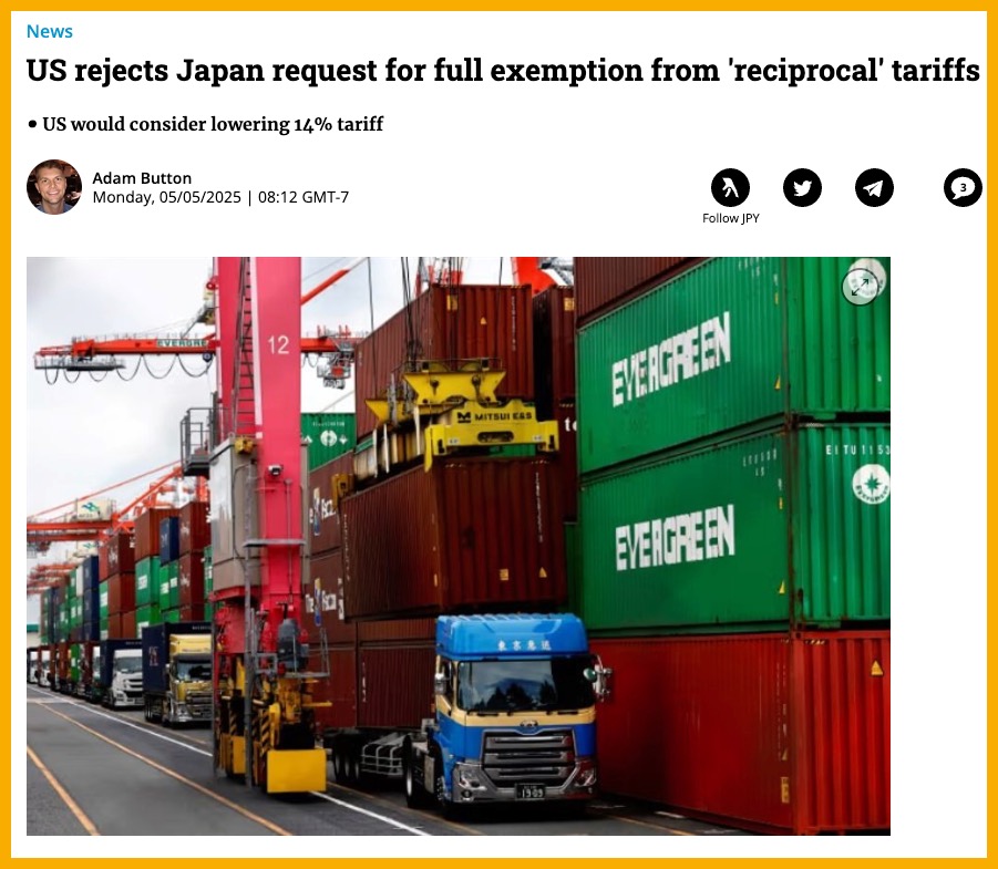 Còn với Nhật Bản, Mỹ đã từ chối yêu cầu miễn hoàn toàn thuế đối ứng từ Nhật, nhưng sẵn sàng xem xét việc giảm mức thuế 14% dự kiến sẽ được áp dụng trở lại vào ngày 9 tháng 7 (sau khi 90 ngày tạm hoãn kết thúc). Các quan chức Mỹ nhấn mạnh rằng việc gia hạn mức thuế 10% hoặc giảm mức thuế 14% sẽ phụ thuộc vào tiến triển của quá trình đàm phán.