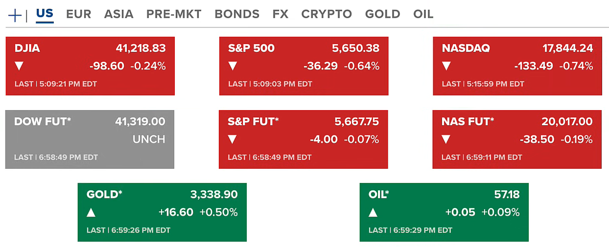 Chứng khoán Hoa Kỳ thứ hai (05/05-US) kết thúc với sự giảm điểm ở cả ba chỉ số, Nasdaq vẫn biến động nhất với mức giảm 0.74%. Hợp đồng tương lai của chứng khoán cũng giảm nhẹ. Giá vàng tăng lên 3338 USD/ounce. Dầu tăng nhẹ lên mức 57 USD/thùng.