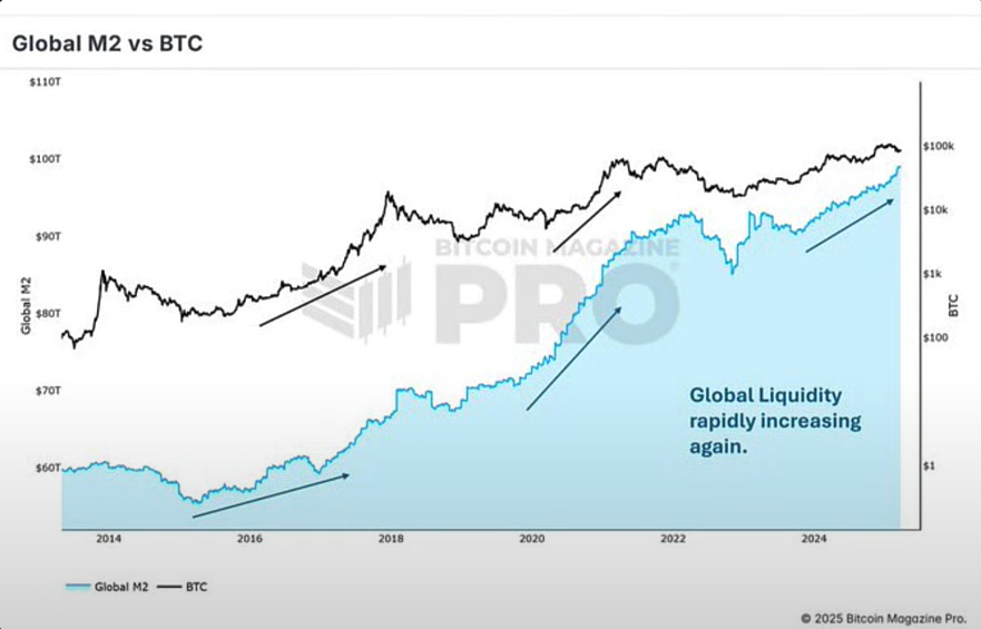 Với dữ liệu M2 toàn cầu tăng lên cho thấy các ngân hàng trung ương trên toàn thế giới đang bơm tiền vào thị trường. Thanh khoản tiền trong nền kinh tế tăng lên khiến các tài sản như vàng và Bitcoin.