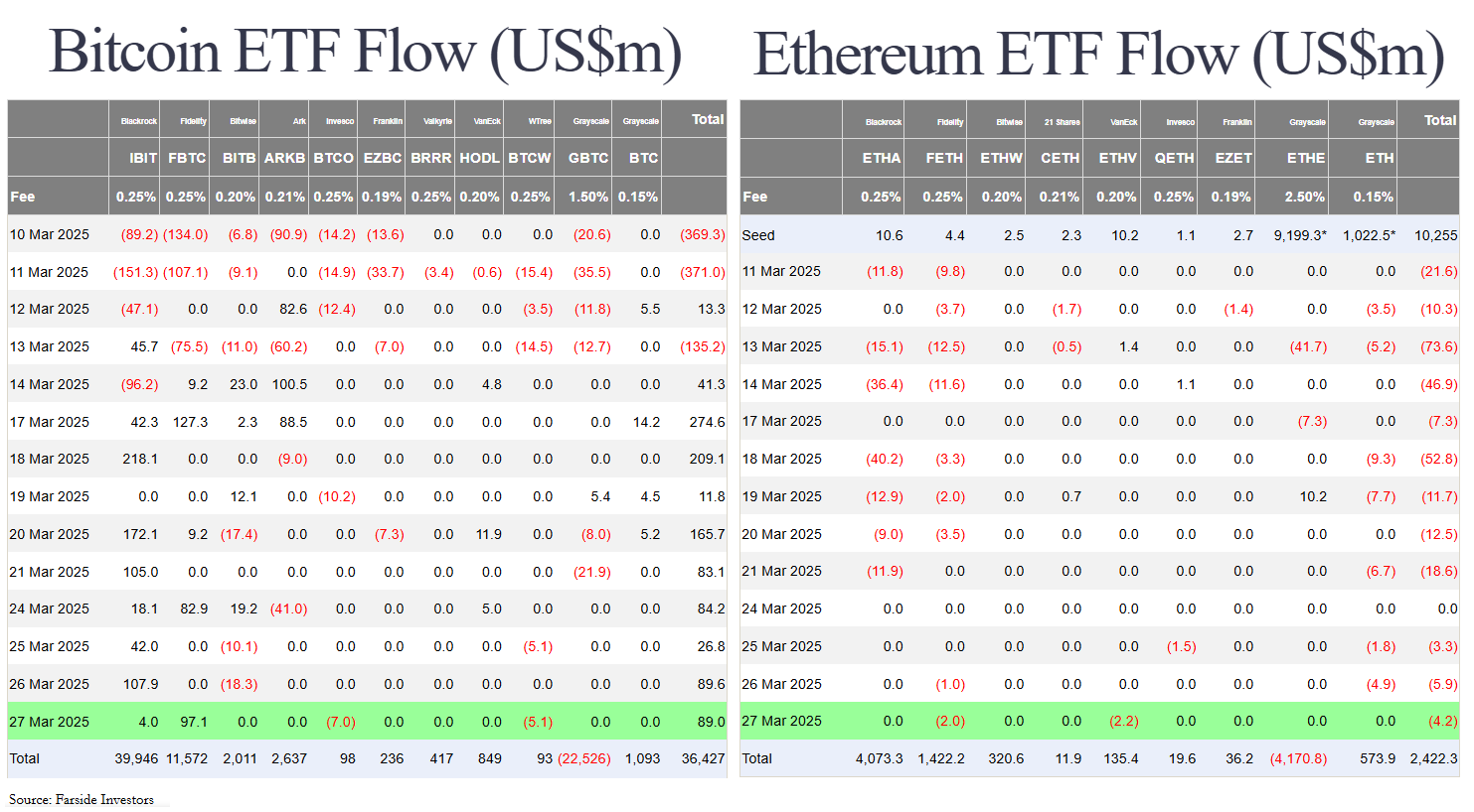 Các quỹ BTC spot ETF Hoa Kỳ trong ngày 27/3 tiếp tục có dòng tiền vào dương 89 triệu USD. Còn ETH ETF vẫn chứng kiến dòng tiền ra 4.2 triệu USD.