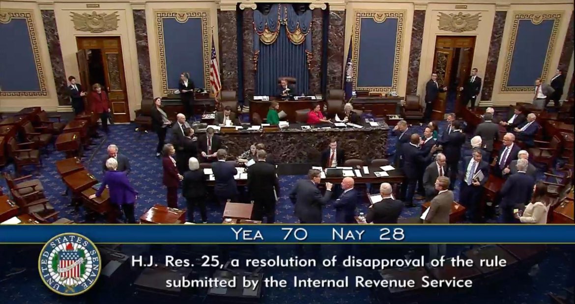 Thượng viện Hoa Kỳ vừa thông qua Đạo luật CRA để vô hiệu hóa quy tắc môi giới DeFi của Cục Thuế IRS lần thứ hai với kết quả cuối cùng 70-28.