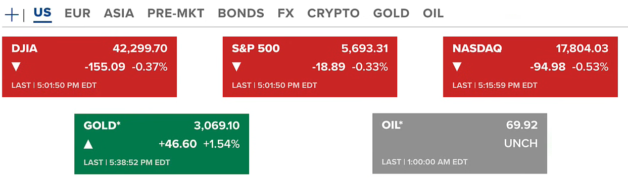 Chứng khoán Hoa Kỳ tiếp tục giảm ở cả ba chỉ số Dow Jones, S&P 500 và Nasdaq trong phiên giao dịch thứ năm (27/03). Hợp đồng dầu tiếp tục tăng lên mức cao mới 3069 USD/ounce. Dầu tăng nhẹ lên quanh 69.9 USD/thùng.