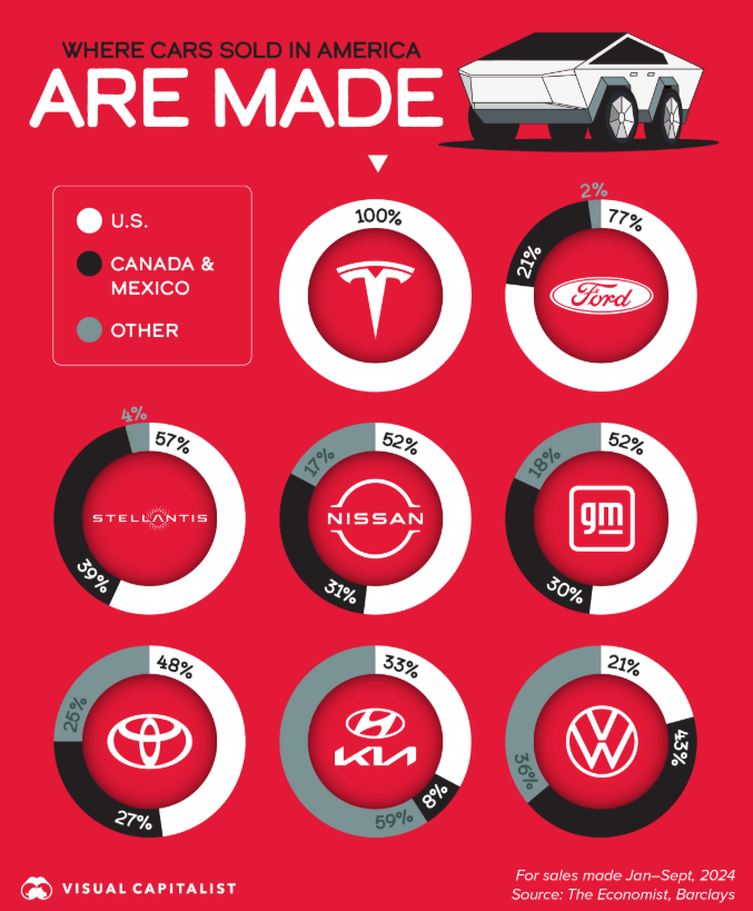 Dưới đây là thống kê một số hãng xe cũng như nguồn gốc sản xuất. Những hãng xe nào sản xuất ở ngoài Hoa Kỳ nhiều sẽ càng bị ảnh hưởng nhiều bởi chính sách thuế qua.