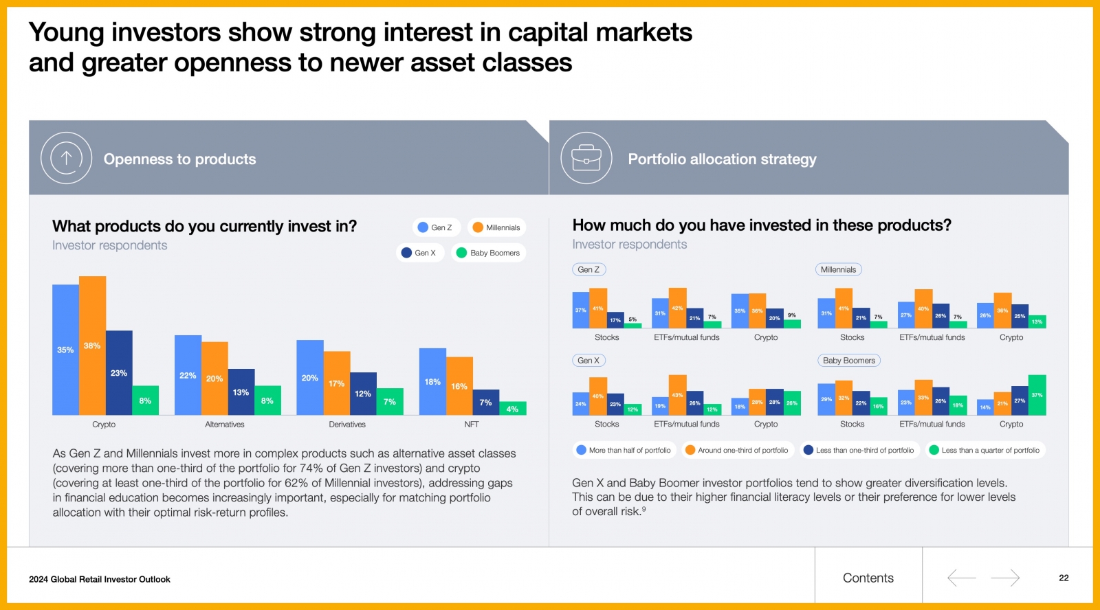 Báo cáo Global Retail Investor Outlook 2024 của Diễn đàn Kinh tế Thế giới đã chỉ ra sự thay đổi rõ rệt trong thói quen đầu tư giữa các thế hệ, với Gen Z đang trở thành lực lượng tiên phong trong việc tiếp cận thị trường tài chính theo cách hoàn toàn mới.